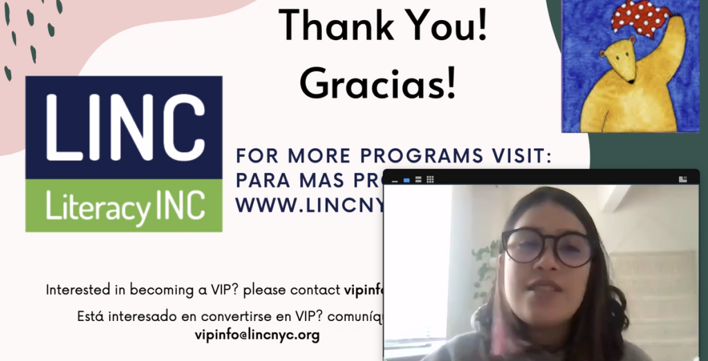 In the past year, our VIPs began leading virtual programs of their own. These Reading Everywhere (RE) events organize their communities around enrichment activities that emphasize the message that, “Reading success is a community-held value.” VIPs share easy-to-apply skills to support their children’s literacy journeys, all while reading, singing, and playing games with their family! You can keep an eye open to register for the next VIP-led RE for you and your child on our website at www.lincnyc.org/events.